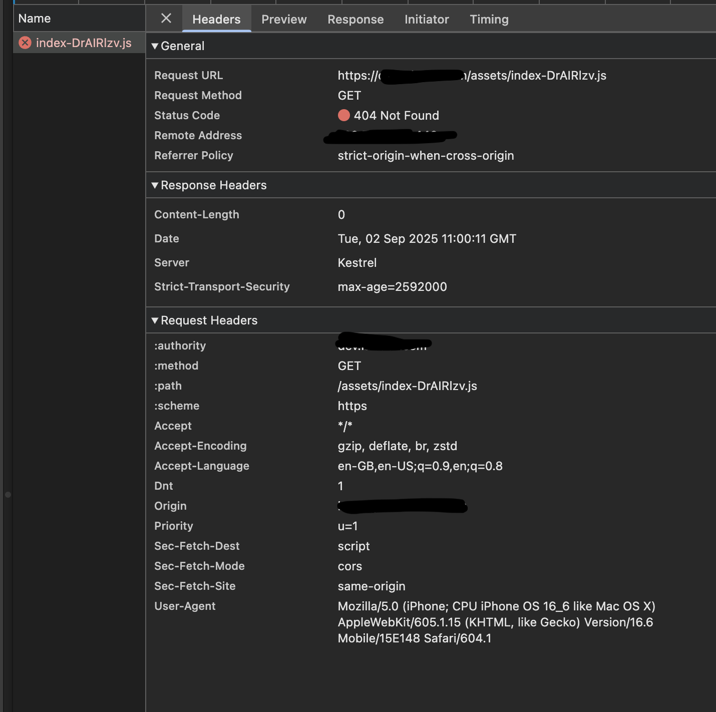 Hi I have an issue where the user cannot navigate when a page is left inactive for a duration of time, the network tab is reporting that it cannot find what looks like a cached file assets/index-DrAIRizv.js
